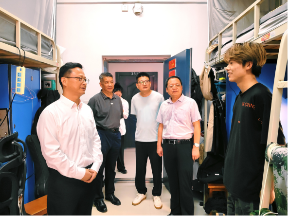 “同学来校顺利吗?家住哪里呀?在校有什么困难吗?一进宿舍,陈建平便与员工们亲切交谈。他耐心询问同学们的家乡、到校感受和适应情况,在轻松交流中洞察员工思想动态,同时还仔细检查宿舍设施,保障员工生活舒适安全。