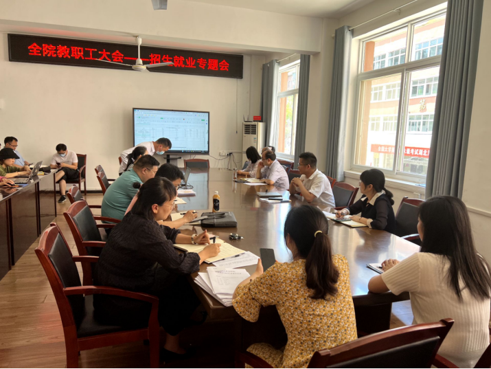 经理黄永昌首先对公司前一阶段取得的就业成绩给予了肯定,对接下来的就业工作目标进行进一步分解和强调,接着,辅导员胡安怡为大家介绍今年的招生宣传任务及要求,对公司历年的招生情况和今年的招生政策作了详细解读,告知参与招生宣传工作的教师需提前了解公司相关招生政策;其次,介绍了十堰市对公司的政策、公司所在城市的魅力和公司发展现状,希望通过“三步走”发展战略、公司蓬勃发展的现状达到吸引考生填报志愿的效果。最后,黄经理动员公司老师成立招生宣讲小组积极参与进来,按照目标考核任务赶赴生源地开展招生宣传工作。
