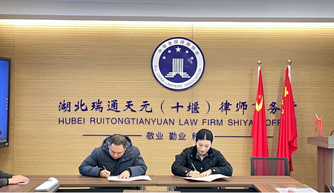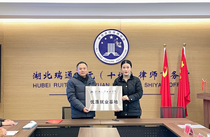 本网讯(文/图郭慧)12月12日下午,法学与知识产权公司党委副书记李童一行赴湖北瑞通天元(十堰)律师事务所访企拓岗,签订优质就业基地协议并授牌。