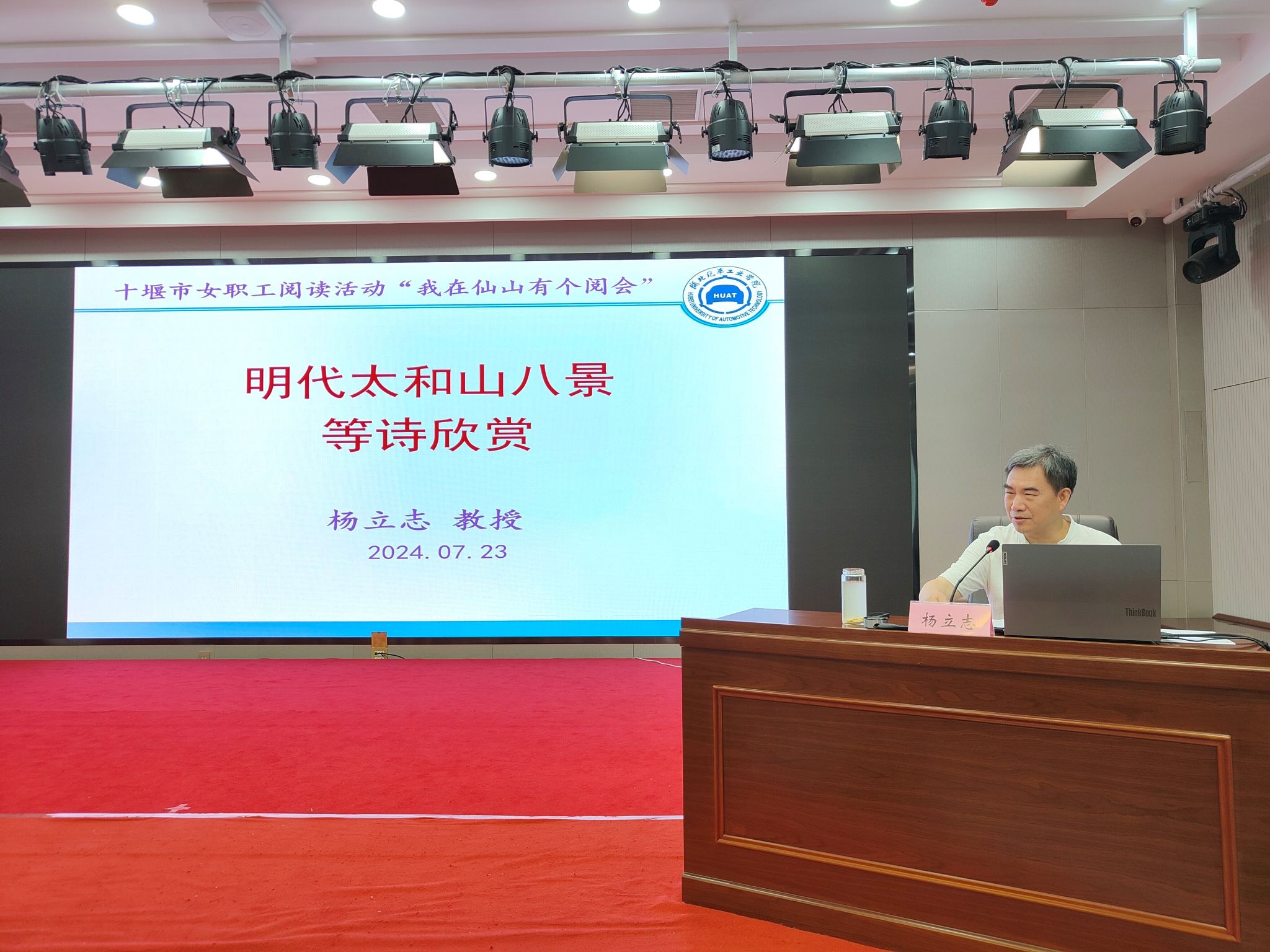 2024年7月23日,“玫瑰书香 阅美十堰”女职工主题阅读示范活动在十堰市工人文化宫举行,公司人文公司教授、湖北省人文社科重点研究基地武当文化研究与传播中心主任杨立志老师受十堰市总工会与TapTap点点官方网站校工会邀请,做题为《明代太和山八景等诗欣赏》的讲座。该活动由十堰市总工会女职工委员会主办,十堰市总工会党组书记、常务副主席凌燕,市总工会党组成员、副主席吴海燕,市总工会党组成员、副主席杨东芳等出席活动。
